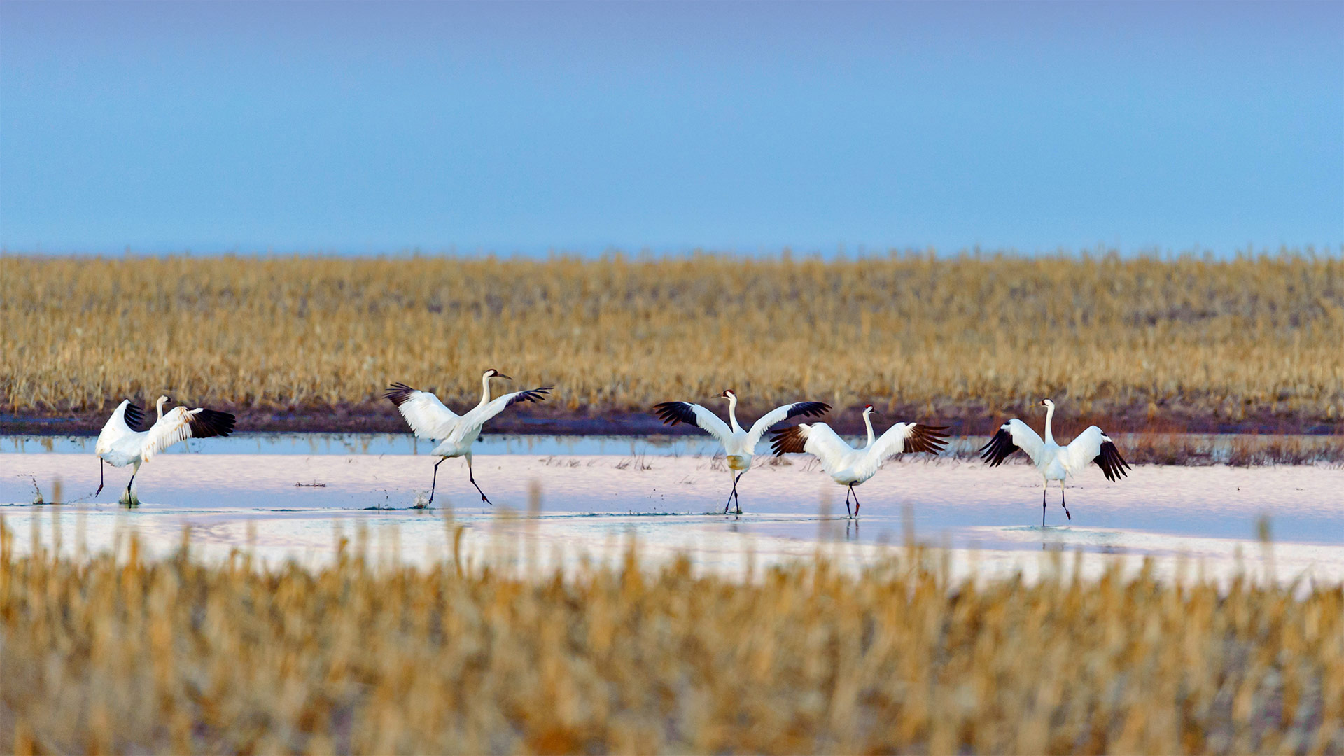 Whooping cranes taking off during spring migration in South Dakota (© Gerrit Vyn/Minden Pictures)